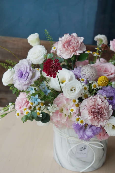 翠粉玫瑰 粉桔梗 淺紫桔梗 白桔梗 大樺木 尤加利 藍星花 深山櫻