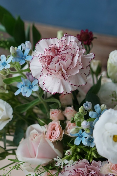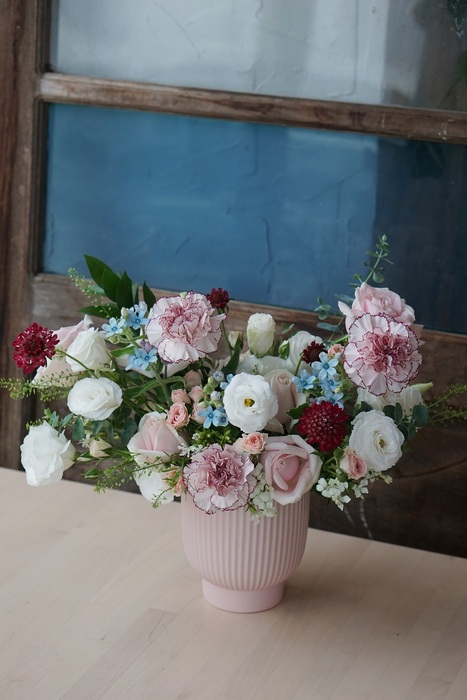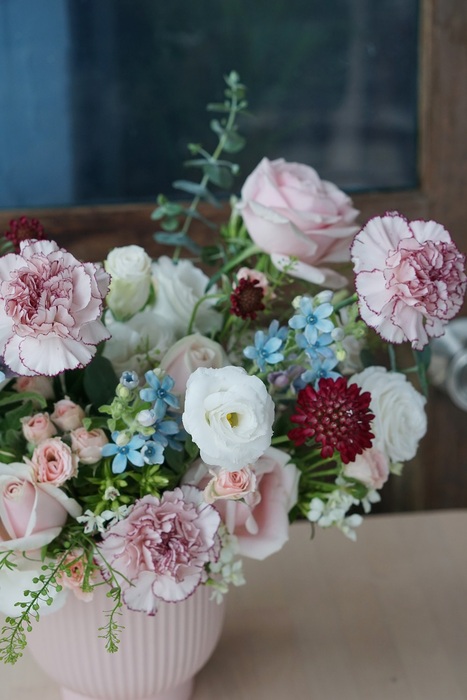翠粉玫瑰 白桔梗 大樺木 尤加利 藍星花 深山櫻